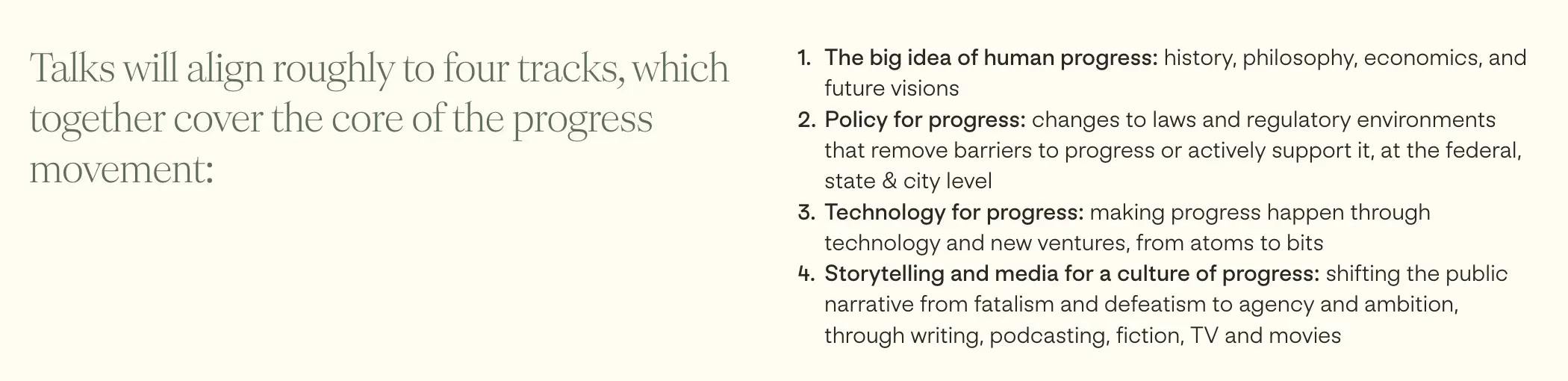 When you start a new event, it’s not a given that it will be well attended. There are so many bad conferences that many people are skeptical of investing 3+ days with travel, and rightly so. And while there wasn’t yet in 2024 a central event for the progress movement, there were several good adjacent events, including Breakthrough Institute’s regular conferences, the Foresight Vision Weekends, and FAI’s galas and events. There were also many specialist events, such as StrongTowns’ annual gathering and YIMBY Town for housing people/YIMBY/urbanism. We needed to create an event that was differentiated and make its value clear to people.A great slate of speakers. We were able to get a commitment from a dozen exciting speakers covering different parts of progress before we announced the first event—including Tyler Cowen, Eli Dourado, Julia deWahl, Virginia Postrel, Brett Kugelmass, and others—a high-quality list that showcased the quality and diversity of people who would be at the conference.