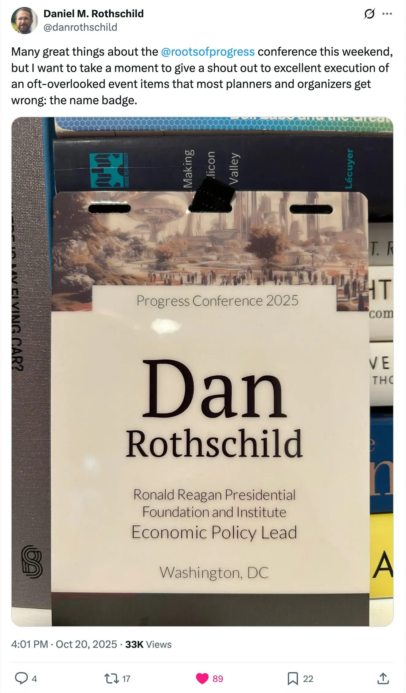 In the days after Progress Conference 2025, political analyst and think tank leader Daniel M. Rothschild had an X thread on the badges at the conference that our not-for-profit, the Roots of Progress Institute, had organized: